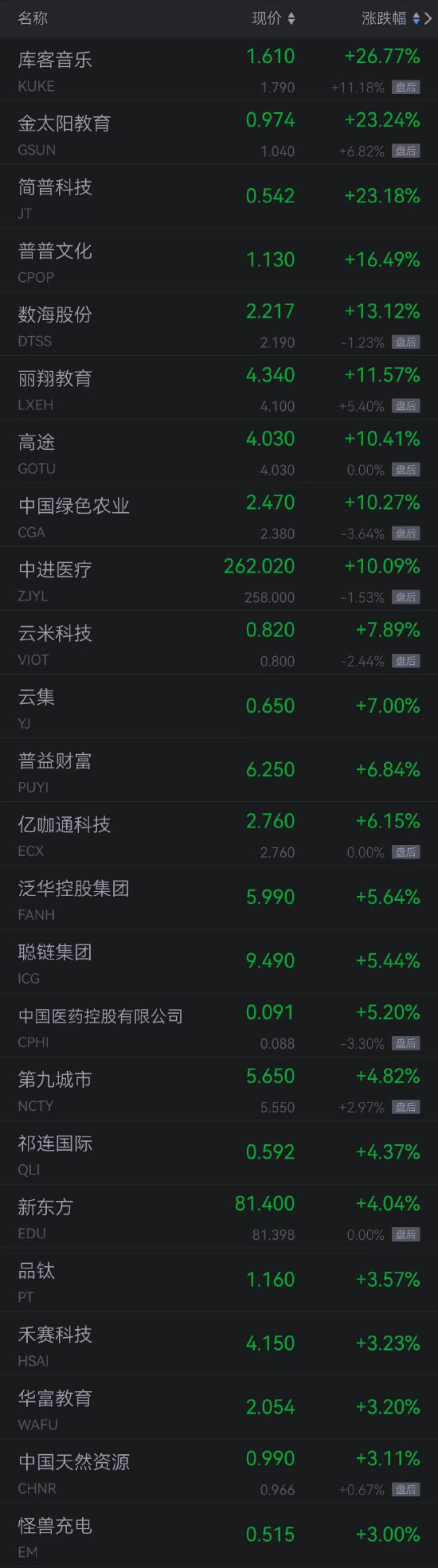 库克音乐涨超26%,金太阳教育、简普科技涨超23%,普普文化涨超16%,数海股份涨超13%,丽翔教育涨超11%,高途、中国绿色农业、中进医疗涨超10%,云米科技、云集涨超7%,普益财富、亿咖通科技涨超6%。