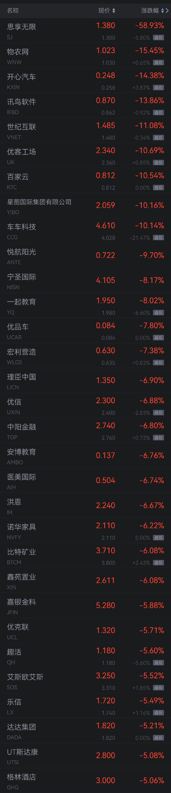 思享无限跌超58%,物农网跌超15%,开心汽车跌超14%,讯鸟软件跌超13%,世纪互联跌超11%,优客工场、百家云、星图国际、车车科技跌超10%,悦航阳光跌超9%,宁圣国际、一起教育跌超8%。