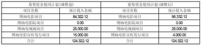 上述调整完成后,博纳电影项目投入募集资金95,332.12万元、电视剧项目投入募集资金25,000万元,博纳电影发行项目投入募集资金为4,000万元,具体情况见下表: