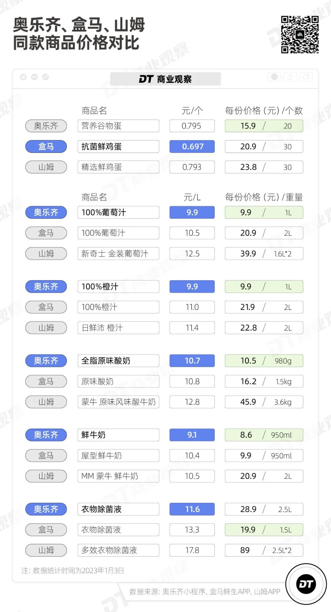那么,盒马、山姆和奥乐齐,到底哪家更便宜?产品有什么区别?它们的策略又有什么不同?
