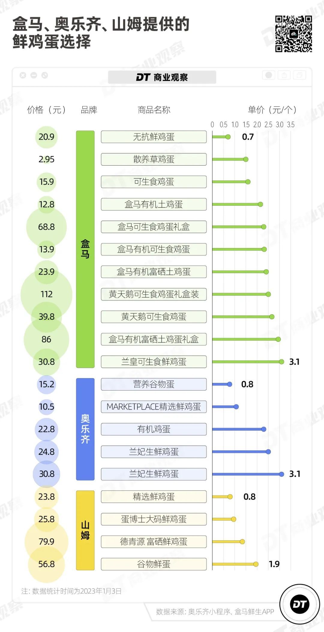 以鲜鸡蛋为例,盒马累计提供了10个SKU,包括移山价的“无抗鲜鸡蛋”,单价从0.7元到3.1元不等,品类从鲜鸡蛋、草鸡蛋、土鸡蛋到可生食鸡蛋一样俱全,既有2个装的小包装,也有45个装的礼盒装。