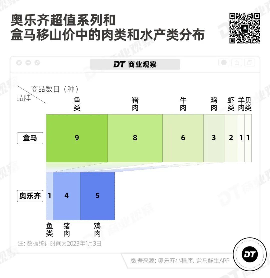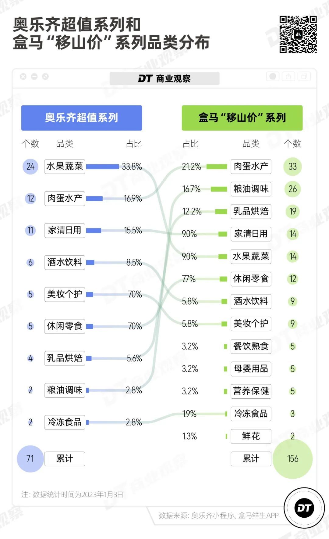 奥乐齐超值系列的71款商品,总共覆盖了9个品类,其中一半都是生鲜(水果蔬菜+肉蛋水产),而盒马“移山价”系列则包含了13个品类,比奥乐齐多了熟食、母婴用品、保健品以及鲜花。