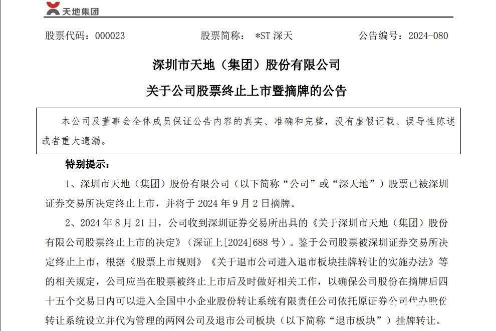 A股首例市值退市股摘牌。9月1日,*ST深天(000023)发布公告称,公司股票已被深圳证券交易所决定终止上市,并将于2024年9月2日摘牌。